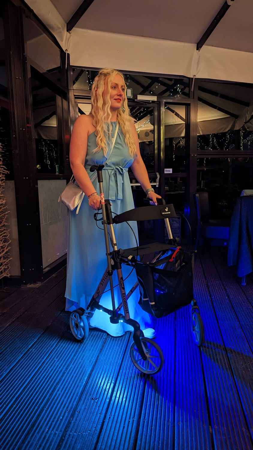 Heute habe ich Einschränkungen. Ich brauche einen Rollator im Alltag – und ja, ich nehme ihn mit auf Feiern und Festivals. Weil ich mein Leben feiere. Weil ich da bin. Weil es nichts gibt, was mich davon abhält, mitten im Geschehen zu stehen – auf eigenen Beinen oder eben auf Rädern.