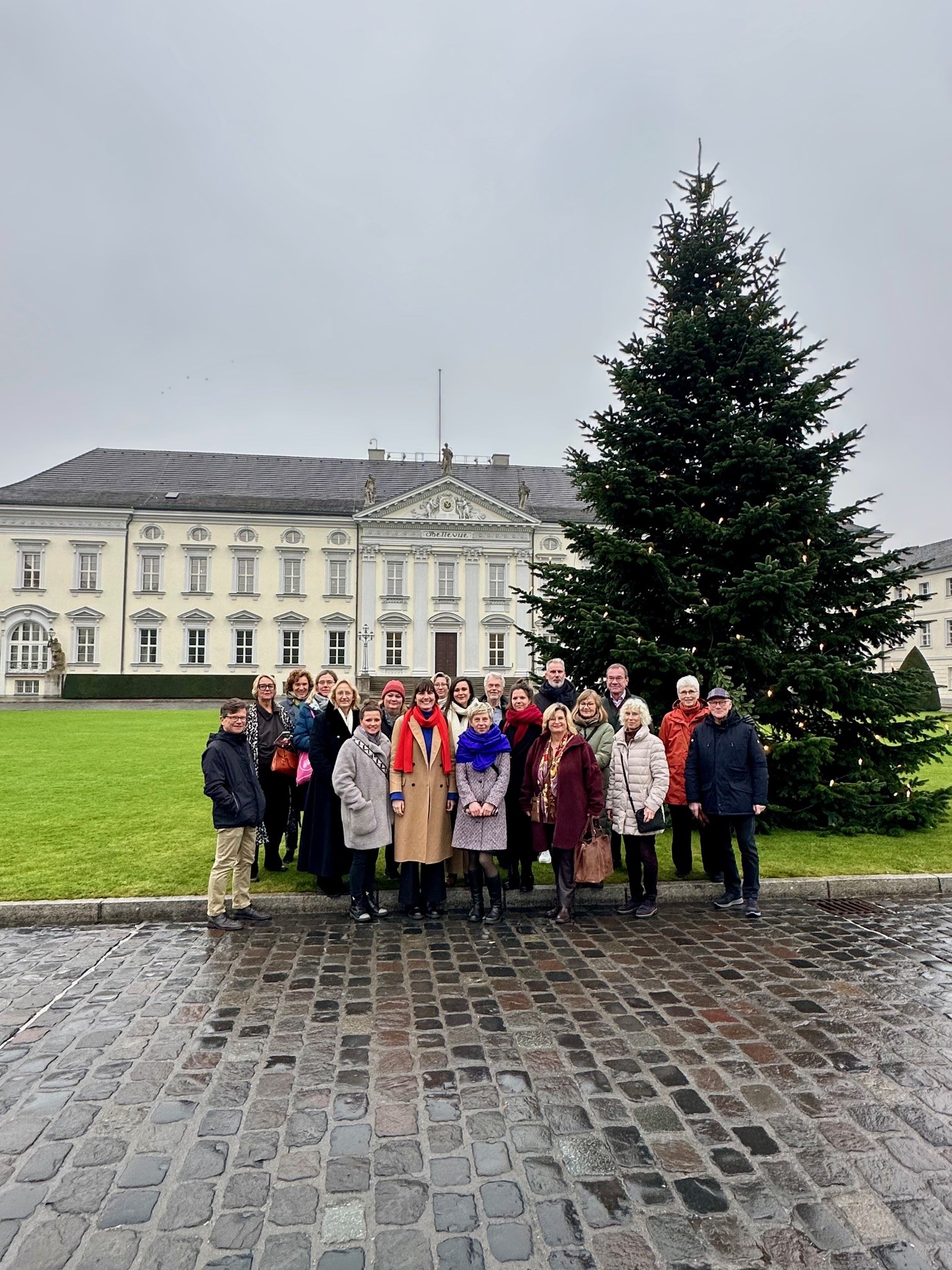 Schon beim Betreten vom Schloss Bellevue wehte den Besucherinnen und Besuchern weihnachtliche Stimmung entgegen: Lichterglanz, festlicher Schmuck und die ganz besondere Atmosphäre des Amtssitzes des Bundespräsidenten. Während Frank-Walter Steinmeier selbst zu dieser Zeit auf Staatsbesuch in Großbritannien war, durften die Gäste des FREUNDESKREISES einen exklusiven Blick in sein Amtszimmer werfen. Die Führung bot spannende Einblicke in die Aufgaben des Staatsoberhauptes und die Abläufe hinter den Kulissen. Gleichzeitig war es eine wunderbare Gelegenheit, die Arbeit der Deutschen Stiftung für junge Erwachsene mit Krebs vorzustellen. Besonders die Kampagne „Recht auf Vergessen“ fand großes Interesse – ein wichtiges Thema, bei dem die Stiftung bereits mehrfach Unterstützung aus dem Bundespräsidialamt erfahren hat. Schon zum 10-jährigen Jubiläum würdigte Elke Büdenbender, die Frau des Bundespräsidenten, das Engagement der Stiftung in einem Grußwort.